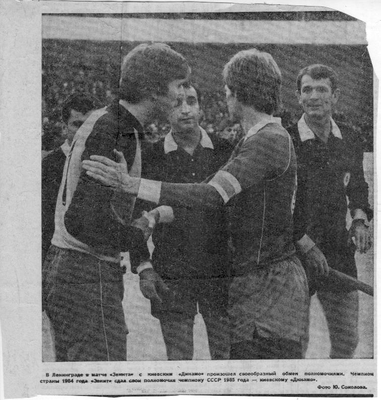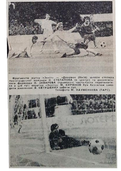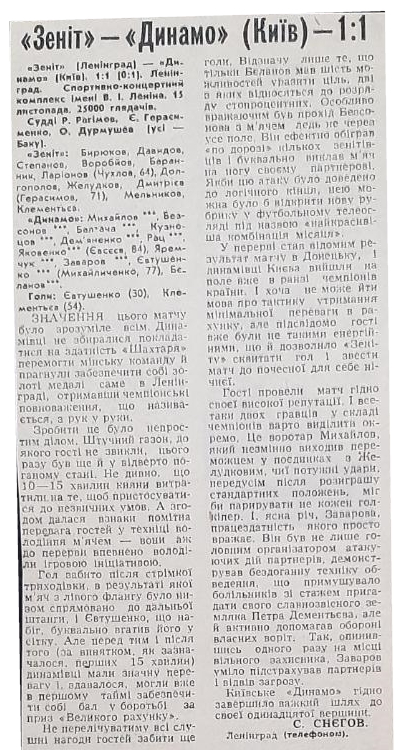 "...Киевляне принимают поздравления "...Итак, вчера определился новый, 48-й по счёту чемпион СССР. Энергично, стабильно выступая на протяжении всего сезона, радуя болельщиков и специалистов футбола, киевские динамовцы заслуженно завоевали золотые медали. В матче с прошлогодним чемпионом страны - "Зенитом" киевляне, в заявочном списке которых не было заболевших Баля и Блохина, поначалу словно присматривались к искусственному газону. Однако первым реальную угрозу воротам создал динамовец Евтушенко. Погасив затем вспышку активности "Зенита", гости продолжали ту игру, которая их больше устраивала в первом тайме. Это были многоходовые комбинации, которые заставляли ошибаться хозяев и в середине поля, и даже вблизи своих ворот. И в конце концов Евтушенко открыл счёт. Второй тайм динамовцы начали уже в ранге чемпиона, поскольку стал известен результат матча в Донецке. Однако киевляне, среди которых искусным владением мячом выделялся Заваров, не собирались довольствоваться достигнутым. И всё же Клементьеву удалось забить ответный гол. Прошлогодние чемпионы - футболисты ленинградского "Зенита" первыми поздравили чемпионов нынешнего года - динамовцев столицы Украины".