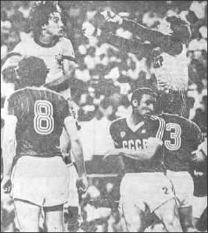 Единоборство Пауло Роберто Фалькао и капитана советской команды Александра Чивадзе.